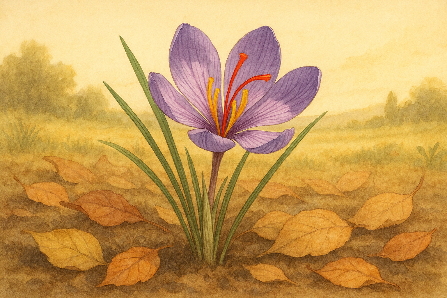 식물학적 일러스트 스타일을 기반으로 하여, 가을 초입의 지중해 들판을 수채화나 색연필 느낌으로 정밀하게 묘사한 장면입니다. 가로형 구도의 화면 한가운데에는 샤프란 크로커스 한 송이가